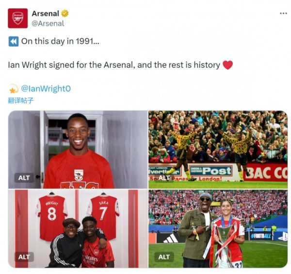 英超在线直播无插件 9月23日讯 34年前的今天,伊恩-赖特加盟阿森纳,枪手官方社媒晒照片回顾。 1991年9月23日,伊恩-赖特从水晶宫加盟阿森纳,1991年到1998年效力阿森纳期间出战288场赛事 ,打进185球,助功 31次,帮助球队赢得1次英超第一名 、2次足总杯第一名 、1次职业联赛 杯第一名 、1次优胜者杯第一名