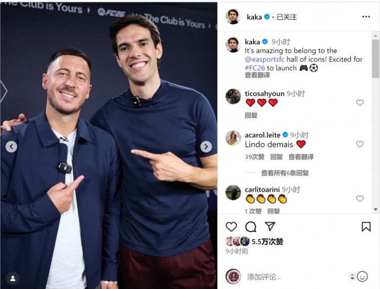 卡卡出席EA活动宣传FC26游戏德甲新闻资讯,英超免费在线高清直播他在社交媒体上晒出与阿扎尔的合照,并写道:“能入选EA传奇名人堂真是太棒了!非常期待FC26正式上线。”