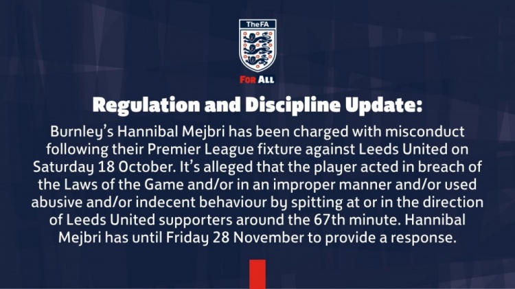 11月11日讯 英足总官方消息,伯恩利中场球员汉尼拔·梅布里因在10月18日对阵利兹联的英超赛事 中不当行为而被指控。
