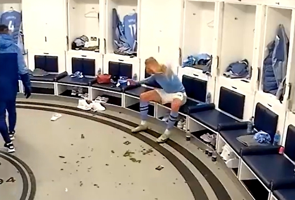 12月31日讯 曼城官推晒视频,更衣室里哈兰德暴怒披头散发砸水瓶,瓶子反弹正好弹进垃圾桶。