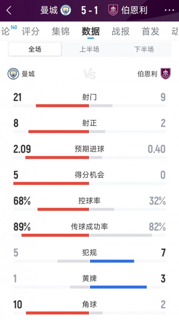 曼城5-1伯恩利全场数据:射球 21-9,射正8-2,积分 机会5-0德甲新闻资讯 9月28日讯 在本轮英超,曼城5-1大胜伯恩利,以下为双方全场数据对比: 曼城vs伯恩利 射球 :21-9 射正:8-2 预期得分 :2.09-0.40 积分 机会:5-0 盘带时间 :68%-32% 违例 :5-7 警告 :1-3 底线球:10-2德甲新闻资讯