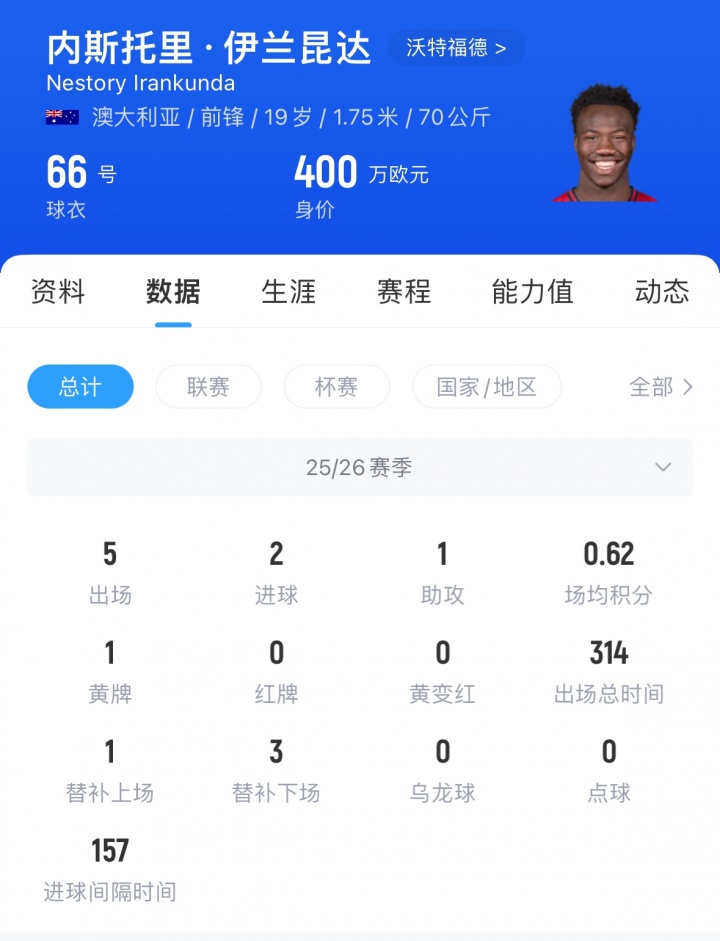 伊兰昆达现年19岁,现效力于英冠的沃特福德,本赛季已登场5次,贡献2球1助。