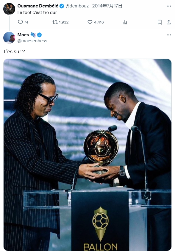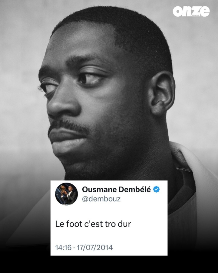当时还在雷恩B队的登贝莱发文:Le foot c'est tro dur(古代足球 太难了)。
