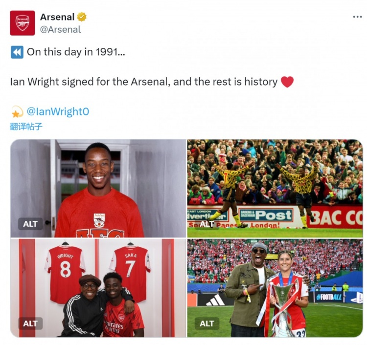 9月23日讯 34年前的今天,伊恩-赖特加盟阿森纳,枪手官方社媒晒照片回顾。