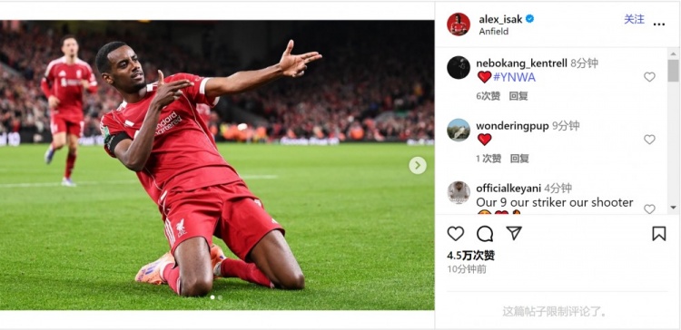 此役伊萨克斩获红军生涯首球,英超免费在线高清直播他在社媒晒出赛事 照片,庆祝球队取胜+攻入处子球。