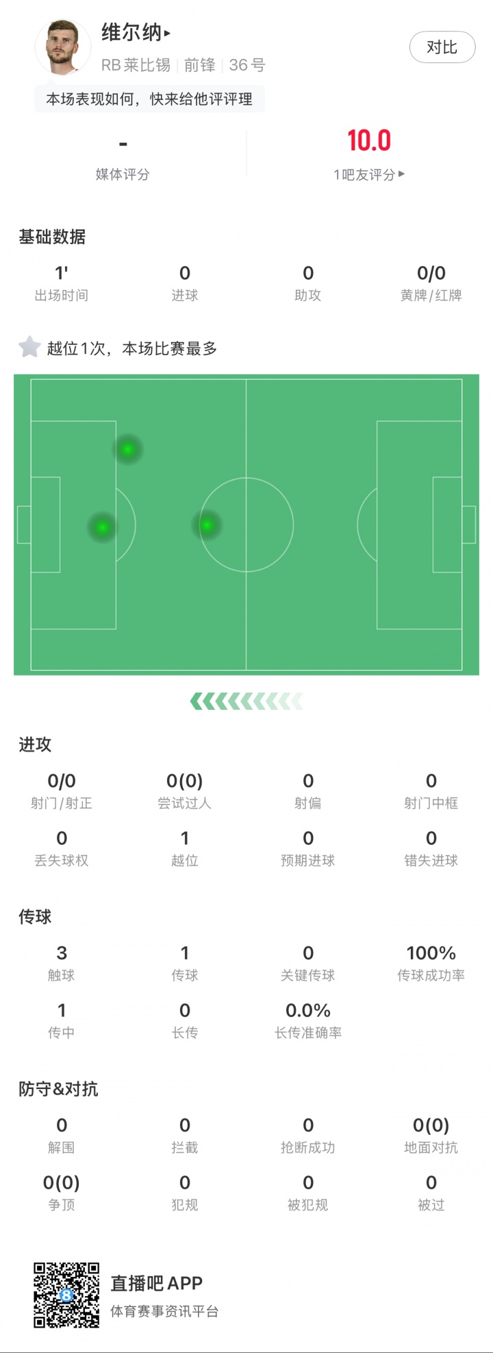 维尔纳在最近一场对阵沃尔夫斯堡的赛事 中后备 登场三分钟,完成一次越位违例 ,还挡出了队友安东尼奥-努萨的一脚射球 ,自己则没有完成射球 。
