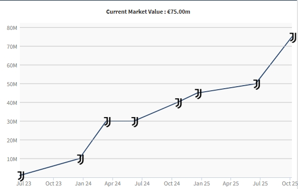 10月07日讯 今日德转更新意甲球员身价,20岁尤文翼锋伊尔迪兹身价暴涨2500万,至7500万欧,英超直播跻身意甲前三。