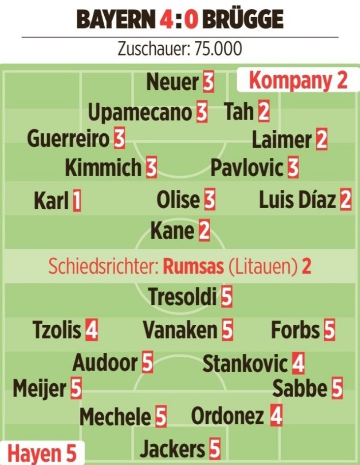 10月23日讯 在本轮欧冠,拜仁4-0大胜布鲁日。《图片报》也对拜仁球员本场表现做出评分,具体如下(德媒评分1分最高,英超直播5负最低):