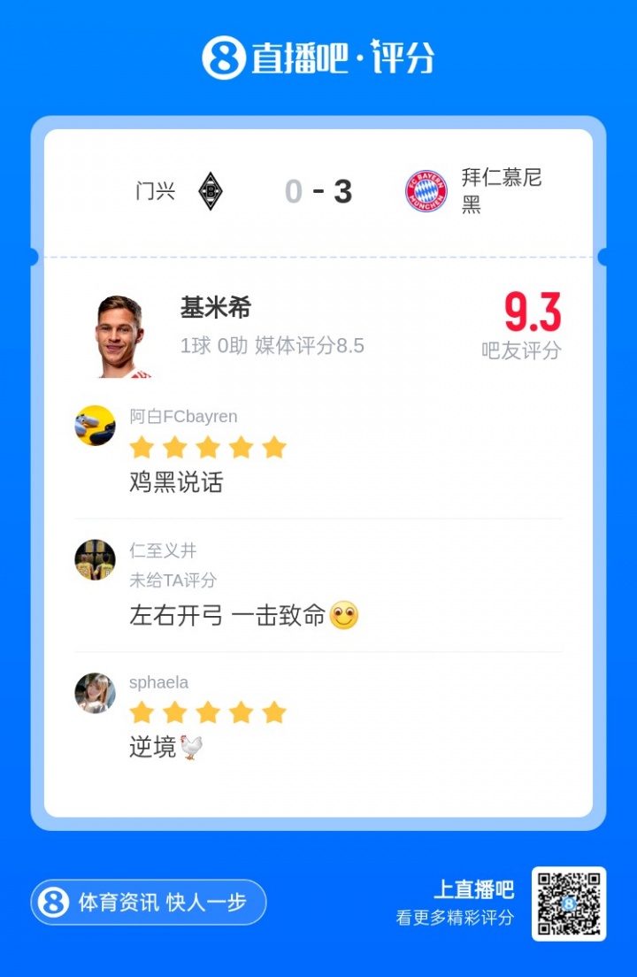 第八轮评选结果出炉,基米希首开记录,帮助拜仁客场应战 3-0完胜门兴收获8连胜领跑德甲,英超直播最终获得吧友1.4万票支持,当选【X小红书德甲第8轮最佳球员】!