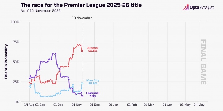 Opta晒英超本赛季截至目前的争冠概率走势:利物浦从赛季初被看好跌到目前的7%英超在线直播免费咪咕,阿森纳目前63.6%,英超免费在线高清直播曼城目前22.9%
