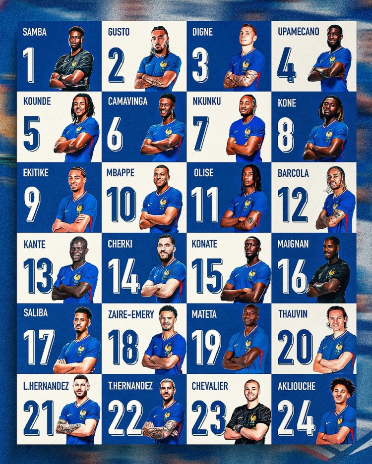 11月12日讯 法国队公布11月国家队24名球员运动活动 服 号码,英超直播姆巴佩10号、埃基蒂克9号、坎特13号。