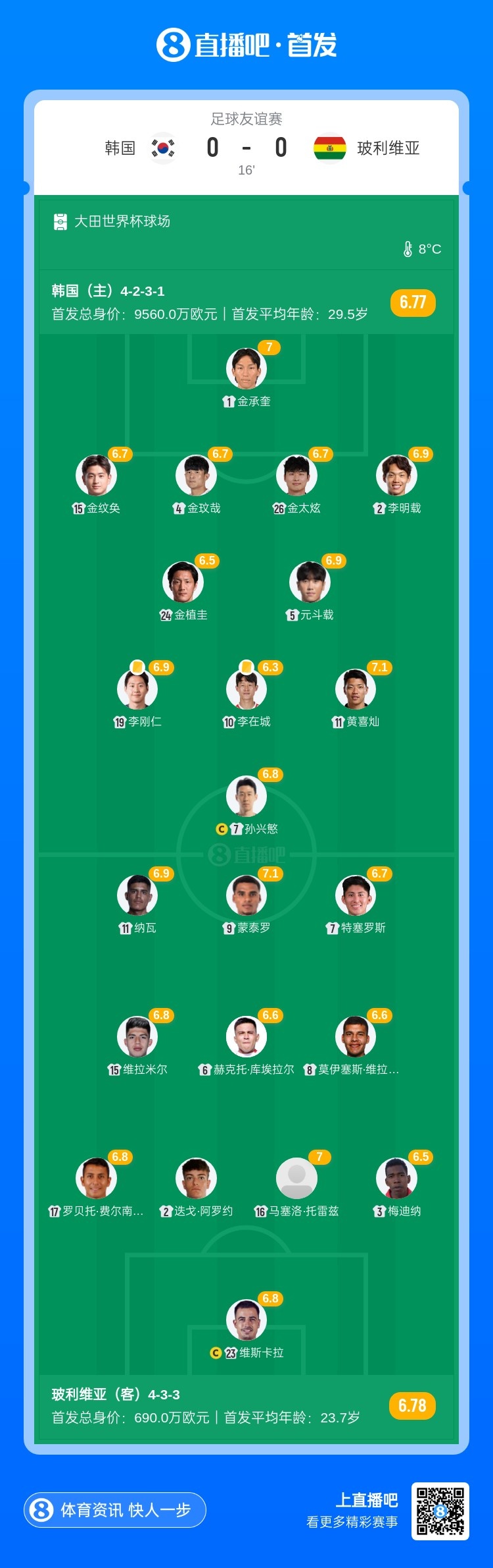 11月14日讯 北京时间19:00,国际古代足球 友情 赛韩国vs玻利维亚,本场赛事 由马宁吹罚!上半场直播足球直播网,金太炫送礼,蒙泰罗失良机;李在城、李刚仁染黄。半场结束,韩国暂时0-0玻利维亚。