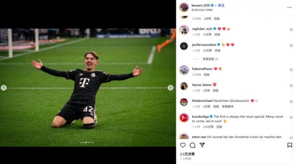 17岁卡尔社媒晒滑跪庆祝照,德甲官方鼓励:职业联赛 处子球总是很特殊英超在线直播超清原声 10月26日讯 拜仁在本轮德甲3-0完胜门兴,17岁青训小将伦纳特-卡尔后备 轰入出色 世界波。 第80分钟,伦纳特-卡尔后备 登场仅4分钟,带球从右路内切,在弧顶位置直接发炮破门,解锁个人德甲处子球。 他也在赛后通过社媒晒出自己的滑跪庆祝照,并未附加文字内容,只是艾特了德甲职业联赛 官方账号,并附上“👋👋