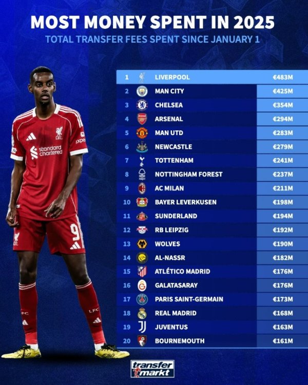 2025年俱乐部转会费支出榜:利物浦4.83亿欧居首,前8均来自英超直播足球直播网 10月25日讯 德转盘点了足坛俱乐部在2025年转会支出榜单(自今年1月1日),其中利物浦居首,具体榜单如下: 1、利物浦 4.83亿欧 2、曼城 4.25亿欧 3、切尔西 3.54亿欧 4、阿森纳 2.94亿欧 5、曼联 2.83亿欧 6、纽卡 2.79亿欧 7、热刺 2.41亿欧 8、诺丁汉森林 2.37亿欧