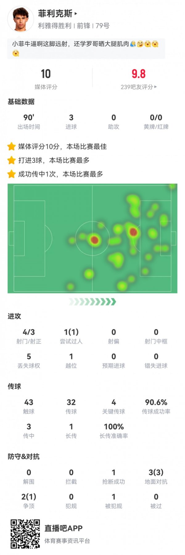 戴帽!菲利克斯数据:4射3正3得分 ,4次关键传送球 ,获评10分满分英超在线直播免费观看直播高清完整版 10月19日讯 本轮沙特联,利雅得获胜 5-1哈萨征服。此役菲利克斯杆位打满全场,球员全场重积分 据如下↓ 4射3正 3粒得分 1次过人1成功 5次丢失球权 1次越位违例 43次触球 传送球 成功率90.6% 4次关键传送球 5次对峙 成功4次 1次被违例 评分10 英超在线直播免费观看直播高