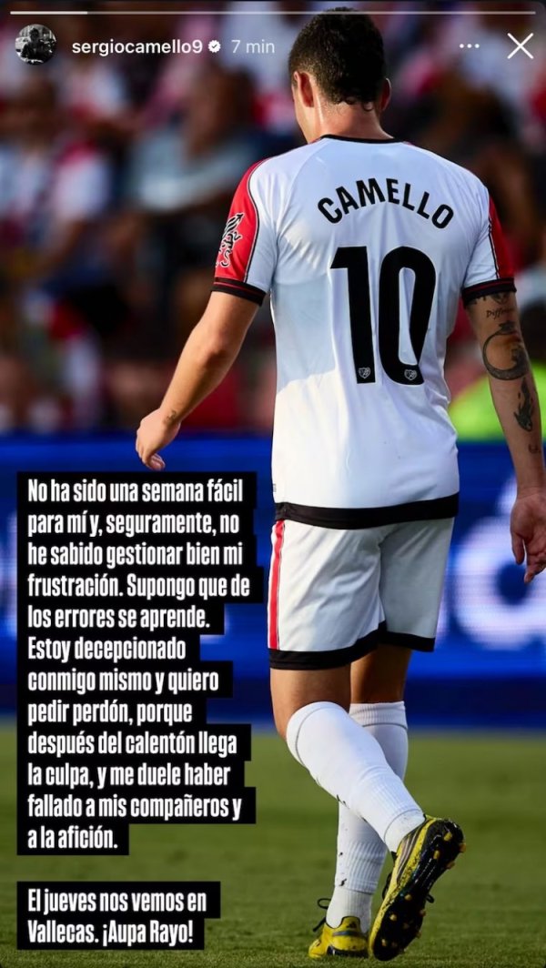 巴列卡诺前场球员因骂曼萨诺被驱逐 罚下,社媒道歉:冲动了,请求原谅英超在线直播吧 9月30日讯 在巴列卡诺0-1不敌塞维利亚的赛事 中,巴列卡诺前场球员卡梅洛在赛事 最后阶段因辱骂主裁判 曼萨诺而被驱逐 罚下,现在他在社交媒体发文道歉。 根据曼萨诺的赛后报告,当时卡梅洛对他表示:“你就是个恶霸。” 现在卡梅洛在社交媒体发文就此进行道歉,他表示:“我对自己感到失望,并想请求原谅,因为热血 退去后