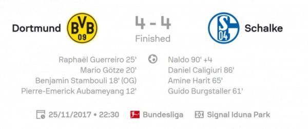 4-4专业户?多特鲁尔德比曾上演惊世名局 4球领跑 4-4战平沙尔克04英超在线看 9月17日讯 欧冠首轮上演超级得分 大战,多特与尤文半场0-0,下半场狂进8球!最终多特4-2领跑 的情况下被尤文补时连扳两球,两队4-4战平。 无独有偶,多特曾在2017年11月的德甲第13轮鲁尔德比上演“惊世名局”!再4-0领跑 的情况下,下半场遭沙尔克04连扳4球英超在线看,最终同样4-4战平!