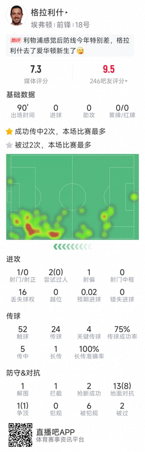 最大威胁, 格拉利什本场数据: 4次关键传送球 , 6次被违例 , 2抄截英超在线直播免费观看 直播吧9月20日讯 在本轮英超,利物浦2-1击败埃弗顿。以下为格拉利什本场数据: 赛事 时间90分钟 1次射球 0射正 2次过人0成功 52次触球 4次关键传送球 传送球 成功率75% 1次解围 1次阻拦 2次抄截 14次对峙 9次成功 6次被违例 评分7.3分 独家看英超就在咪咕英超在线直播免费观看