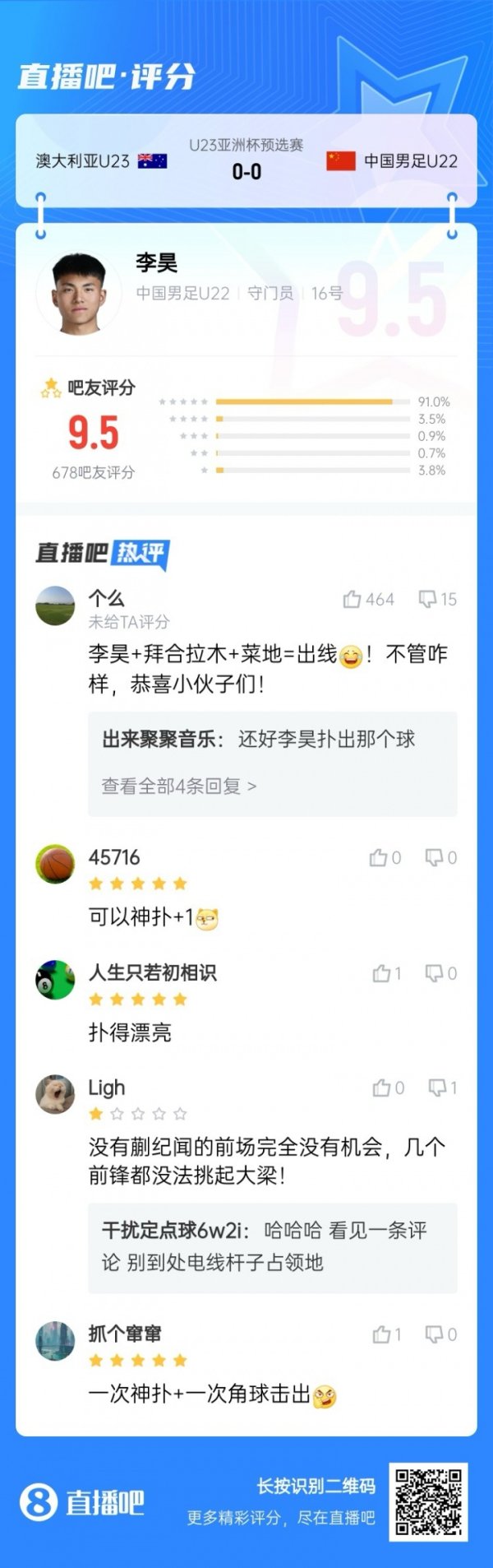 没你真不行!李昊贡献神扑力保古代足球 门 不失,吧友给他打出9.5的高分英超ds. 09月09日讯 U22国足0-0战平澳大利亚,晋级下一轮 U23亚洲杯正式比赛。 本场赛事 ,守门员李昊表现出色,其中贡献了最关键的一次神扑,力保古代足球 门 不失,帮助球队逼平对手。 英超ds.