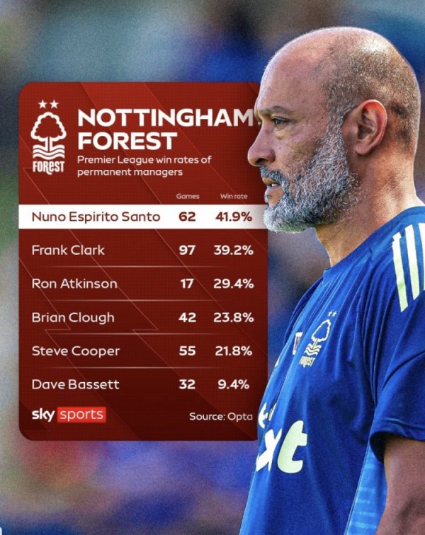 努诺手下的诺丁汉森林英超胜率41.9%,是队史胜率最高的主帅英超超积分榜 9月9日讯 诺丁汉森林官宣努诺下课,根据数据统计 努诺是森林队史英超胜率最高的主帅。 努诺率队出战62场英超赛事 英超超积分榜,胜率达到了41.9%。上赛季努诺率队拿下英超第7,获得欧联杯资格。