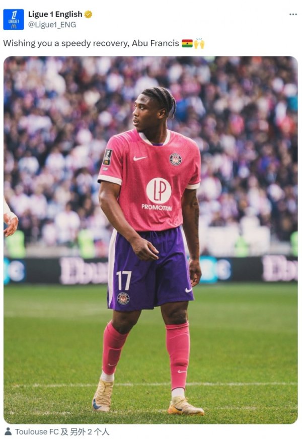 图卢兹中场球员弗朗西斯国家队友情 赛重伤,法甲官方祝他早日复健英超在线观看 11月14日讯 法甲官方更新社媒动态,祝效力于图卢兹的加纳中场球员阿布·弗朗西斯早日复健 。 加纳对阵日本的麒麟杯友情 赛,阿布·弗朗西斯封堵田中碧射球 时小腿被踢到,发生严重变形,直接被担架抬出场外。 法甲官方社媒晒出阿布·弗朗西斯的照片,配文:“祝你早日复健 。” 英超在线观看
