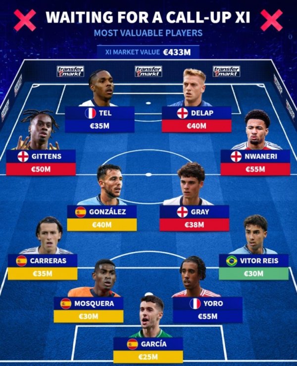 德转列仍未获国家队征召最贵阵:西英各4将,特尔&约罗&雷斯在列英超赛程2425升级球队 9月7日讯 《转会市场》统计了当前仍未能获得国家队征召的球员身价最贵阵形 ,西班牙和英格兰各4将在列。 德转列仍未获国家队征召最贵阵:总身价4.33亿欧元 前场球员:特尔(法国,3500万)、德拉普(英格兰,4000万) 中场球员:吉滕斯(英格兰,5000万)、尼科-冈萨雷斯(西班牙,4000万)、阿奇