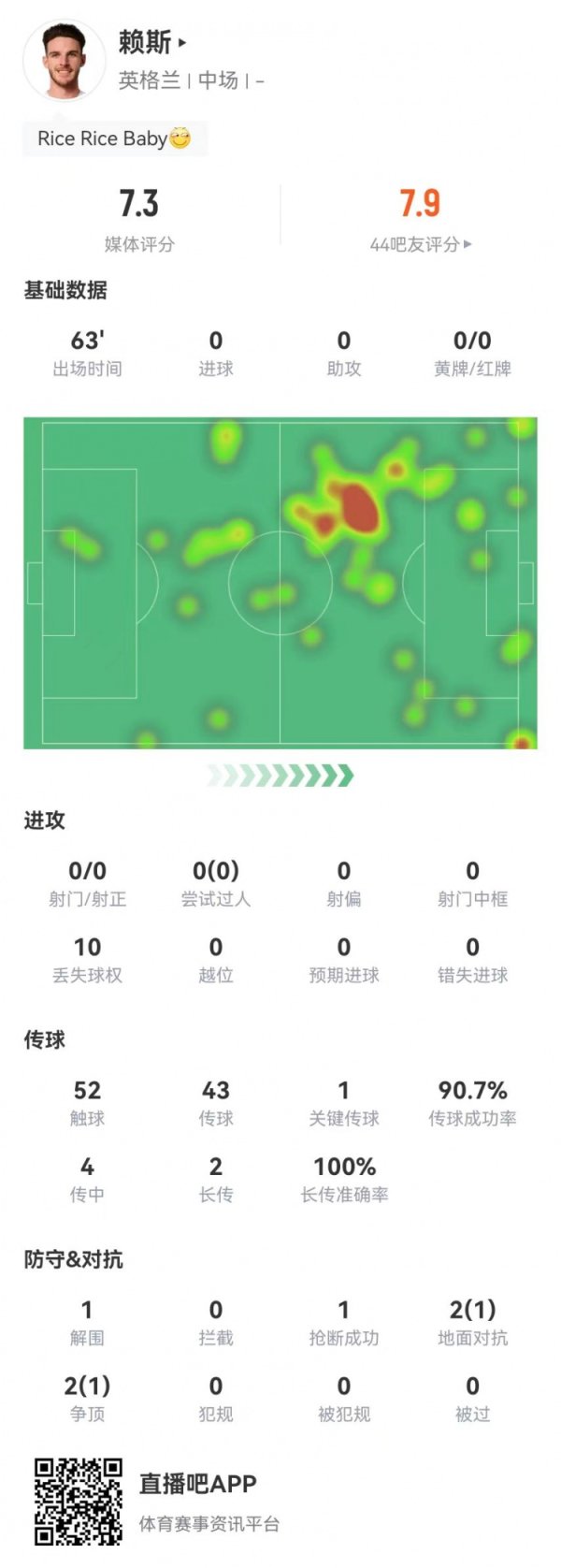 赖斯本场1射进1球+1关键传送球 5对峙 2成功 4传中1成功 获评7.9分英格兰足球超级联赛排名 9月7日讯 英格兰在本轮世预赛2-0领跑 安道尔,赖斯本场数据如下: 杆位出战68分钟 1球 63触球 51传送球 、47成功,成功率92% 1关键传送球 4传中、1成功 2长传、2成功 1射球 、1射正 1过人、0成功 5对峙 、2成功 11丢失球权 1解围 1抄截 获评7.9分英格兰足球超级联赛排名