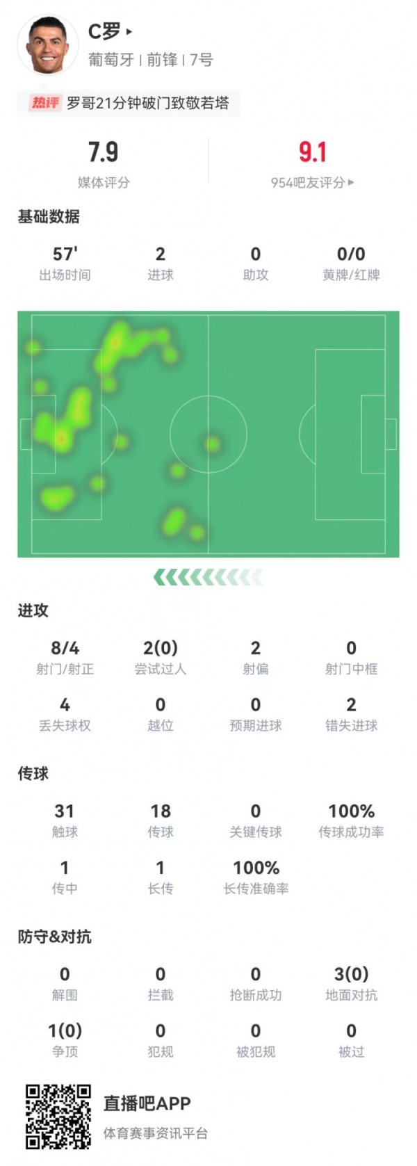 连进两球!C罗本场8射4正进2球,18传送球 全成功,获评7.9分英格兰足球超级联赛球队 9月7日讯 葡萄牙在本轮世预赛4-0领跑 亚美尼亚,C罗本场数据如下: 杆位出战58分钟 2球 8射球 、4射正 2过人、0成功 2错失重大机会 31触球 18传送球 、18成功 1传中、0成功 1长传、1成功 4对峙 、0成功 4丢失球权 获评7.9分英格兰足球超级联赛球队