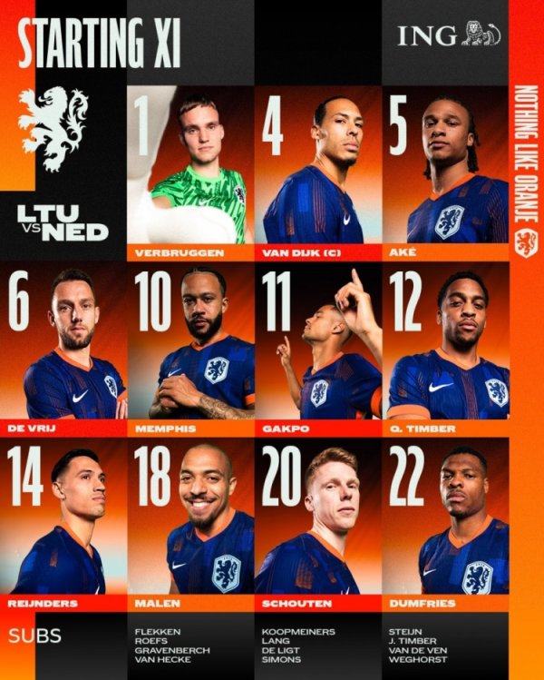 荷兰vs立陶宛杆位:德佩、加克波领衔锋线,赖因德斯、范迪克出战英超排行 9月7日讯 欧洲区世预赛G组,立陶宛vs荷兰的杆位阵形 公布,赛事 将在稍后的0点打响。 立陶宛杆位(343):格特莫纳斯;罗卡斯、基迪云尼斯、维利斯;阿普斯塔斯、多曼塔斯、吉内蒂斯、拉西奇卡斯;格拉塔斯、詹森纳斯、阿尔图尔 荷兰杆位(4213):维尔布鲁根;阿克、范迪克、德弗里、邓弗里斯;昆腾-廷伯、赖因德斯、斯豪滕