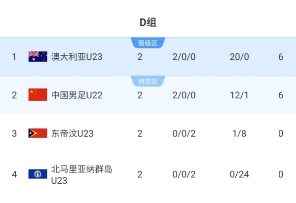 末轮决第1!积分榜:U22国足追赶 9个净胜球第2 澳大利亚2战轰20球20242025赛季英超联赛积分排行榜 09月06日讯 U23亚洲杯预选赛D组第二轮结束,澳大利亚6-0大胜东帝汶,两战打进20球0丢球,U22国足10-0击败北马里亚纳群岛,以9个净胜球的劣势位列第二。 本届U23亚洲杯预选赛,小组第一将直接晋级下一轮 正式比赛,11个小组中4个最好成绩的小组第二也将晋级下一轮 。 末轮赛事