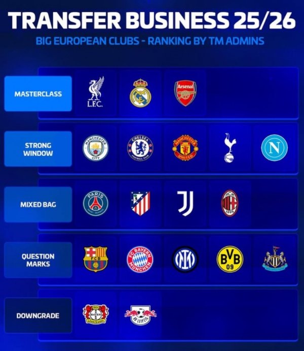 认同吗?德转评今夏转会操作:军皇枪大师级,药厂&莱比锡遭差评20242025英超积分榜射手榜 9月6日讯 主流职业联赛 夏季转会窗已经结束,《转会市场》也为今夏多家欧洲俱乐部的转会操作进行了评级: 大师手笔:利物浦、皇马、阿森纳 强劲夏窗:曼城、切尔西、曼联、热刺、那不勒斯 喜忧参半:巴黎、马竞、尤文、米兰 疑问重重:巴萨、拜仁、国米、多特、纽卡 实力骤降:勒沃库森、莱比锡2024202