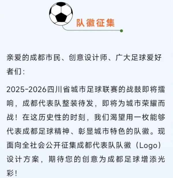“川超”成都代表队队标 (Logo)征集令发布,最高奖10000元!9月4日讯 “川超”职业联赛 开赛在即,据“锦观新闻”报道英超最新战报积分榜,成都代表队队标 (Logo)征集令发布,最高奖10000元! 设计需求体现成都特色、彰显古代足球 精神、设计简洁醒目、色彩和谐 鲜明,且必须为原创作品。投稿时间为9月4日-9月7日。 英超最新战报积分榜