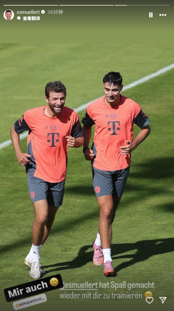 老同志回家!穆勒回拜仁练习 ,帕夫洛维奇:很高兴又和你一起练习英超直播免费观看在线 09月04日讯 穆勒在国际赛事 日回了一趟德国,并在老东家拜仁进行练习 保持竞技状态 ,与他一起练习 的还有帕夫洛维奇。 帕夫洛维奇社媒晒与穆勒练习 的照片,他写道:很高兴又能和你一起练习 😃 穆勒回复:我也是😃英超直播免费观看在线