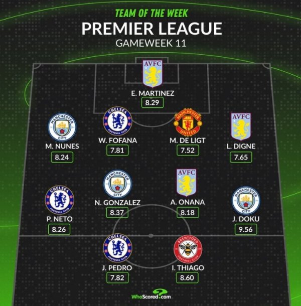 Whoscored评本轮英超最佳阵:多库领衔,德里赫特、佩德罗在列直播足球直播网 11月10日讯 本轮英超战罢,数据网站Whoscored也盘点了本轮英超评分最高阵形 ,具体如下: 守门员:马丁内斯(维拉) 后场球员:努内斯(曼城)、福法纳(切尔西)、德里赫特(曼联)、迪涅(维拉) 中场球员:内托(切尔西)、尼科-冈萨雷斯(曼城)、奥纳纳(维拉)、多库(曼城) 前场球员:若昂-佩德罗(切尔西)